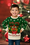 JULE propone questo maglione da bambino, girocollo, polsinialle maniche, fascia in vita, disegnonatalizio, scritta in paillette, morbido e caldo, ART. 22SEQK3.