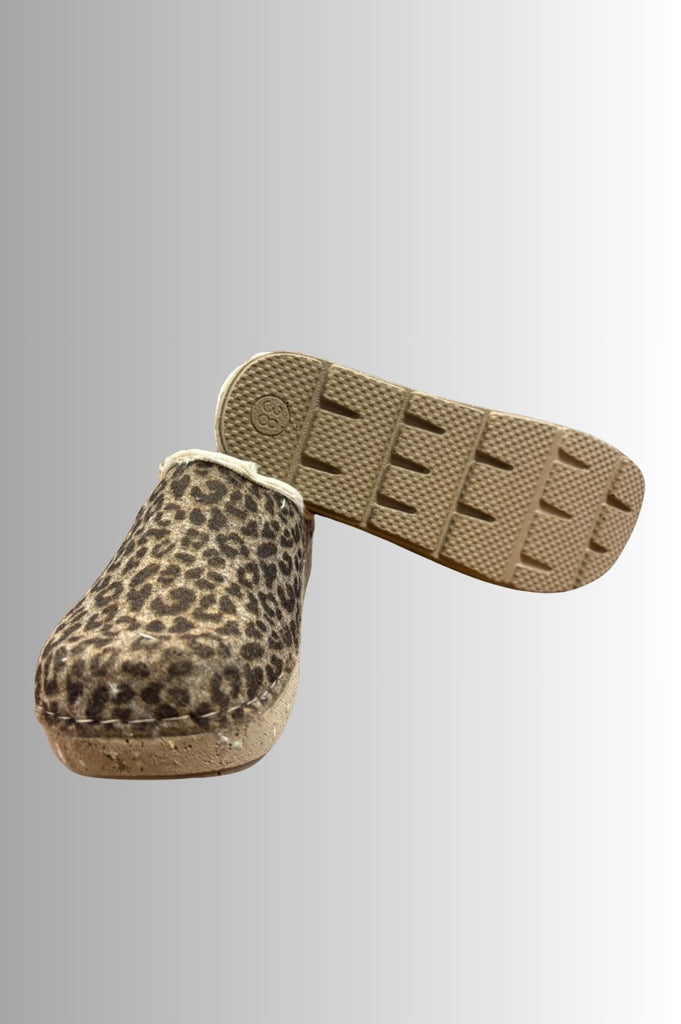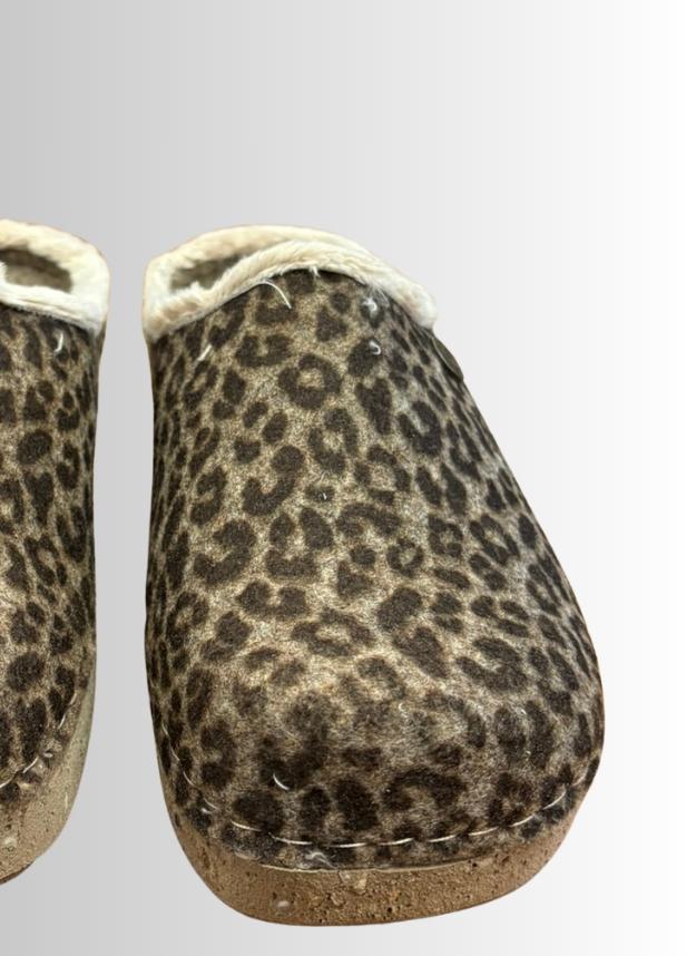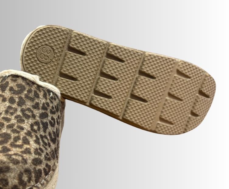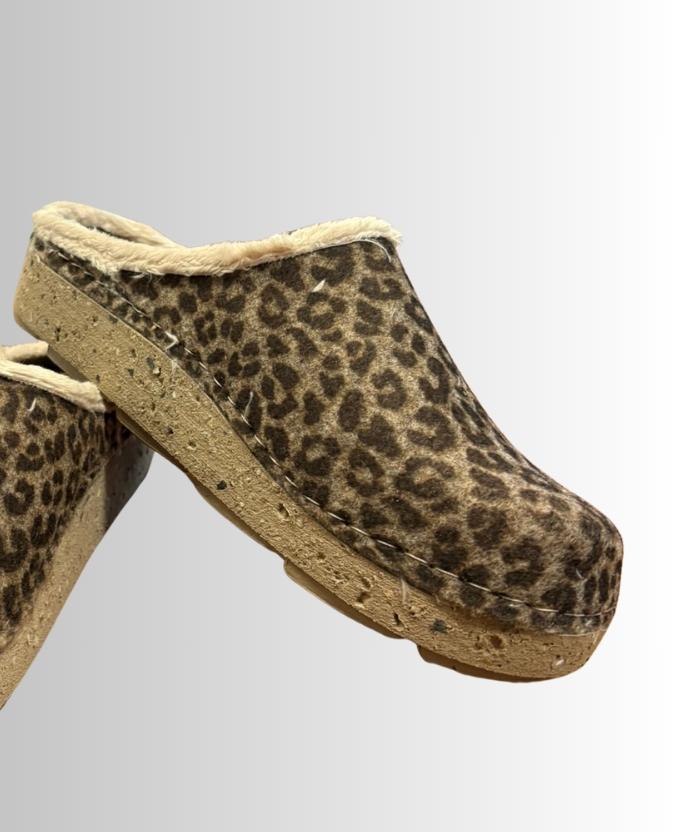Ciabatta donna calda e confortevole con fantasia animalier e bordo in morbida eco pelliccia.