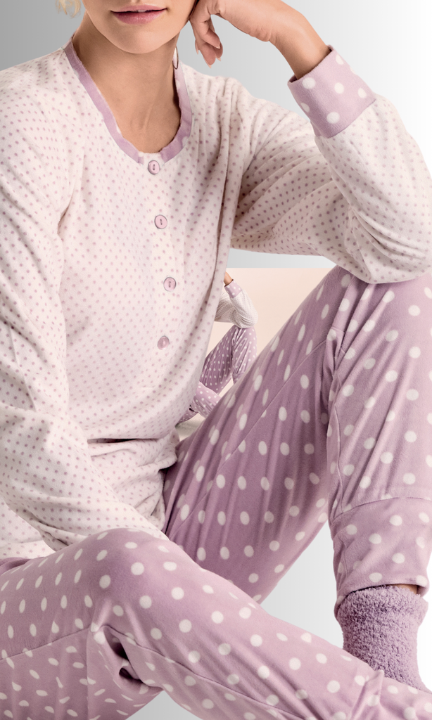 Eleganza e comfort si incontrano in questo pigiama Infiore in morbido tessuto microcoral. La maglia a serafino con quattro bottoni presenta una raffinata fantasia a piccoli pois, arricchita da bordi in contrasto che riprendono il colore del pantalone. I pantaloni, con motivo a pois più grandi, elastico in vita e polsini alle caviglie, completano il completo con un gioco di contrasti armonioso e moderno. Realizzato in 100% poliestere, regala calore e morbidezza, perfetto per i tuoi momenti di relax nelle serate più fredde.