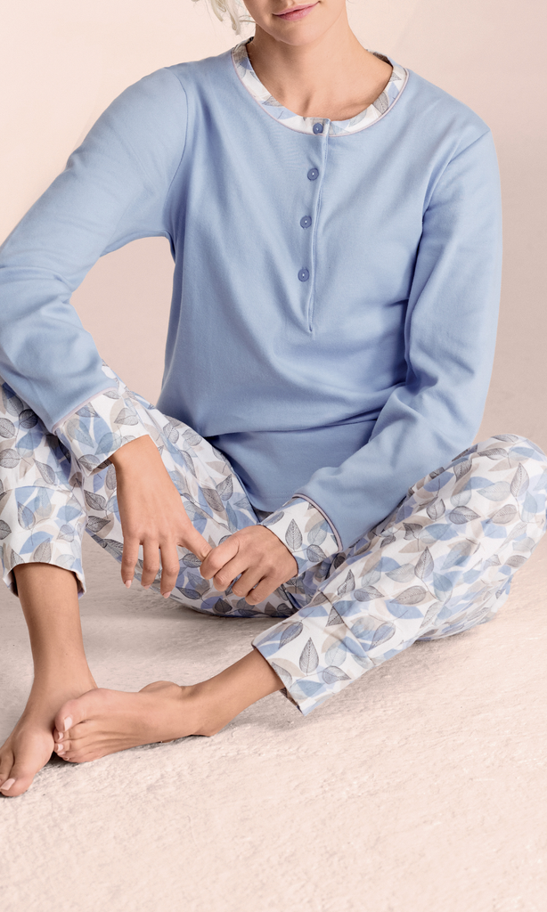 INFIORE propone questo pigiama donna ART. NTR652890 in termo cotone con maglia a serafino con bordi in fantasia e polsini.