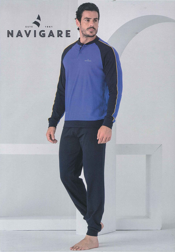 Pigiama da uomo in puro cotone, pensato per offrire comfort naturale e una vestibilità piacevole in ogni momento della giornata. La maglia a manica lunga con collo serafino a bottoni presenta un design moderno con inserti a contrasto sulle maniche e una linea pulita, valorizzata dal piccolo logo sul petto.