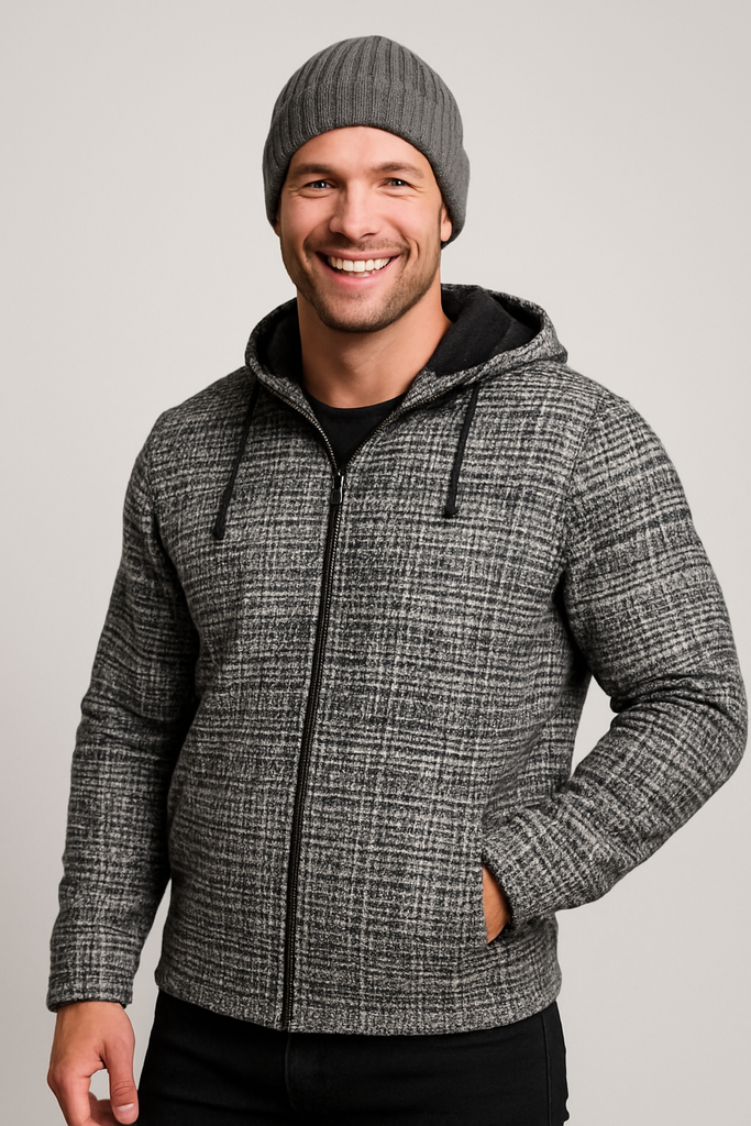 X-CAPE propone questo giubbino da uomo articolo BRD QUADRO, modello con cappuccio, fantasia a quadri, due tasche laterali con zip e chiusura con cerniera sul davanti.