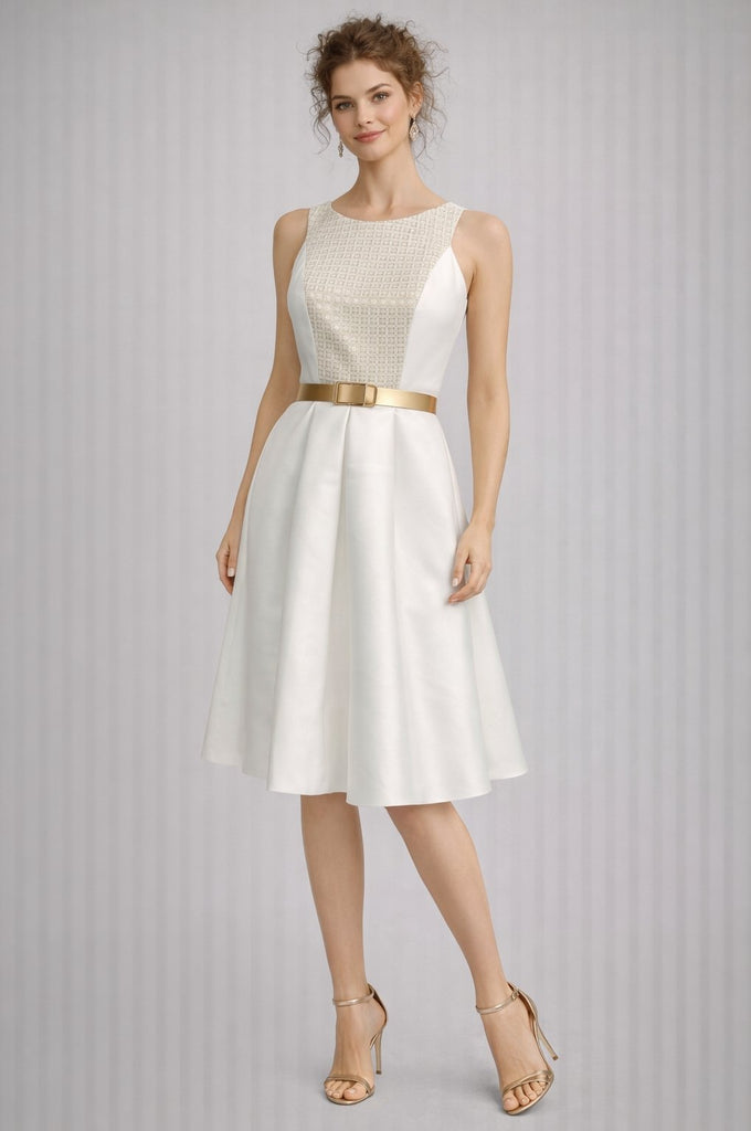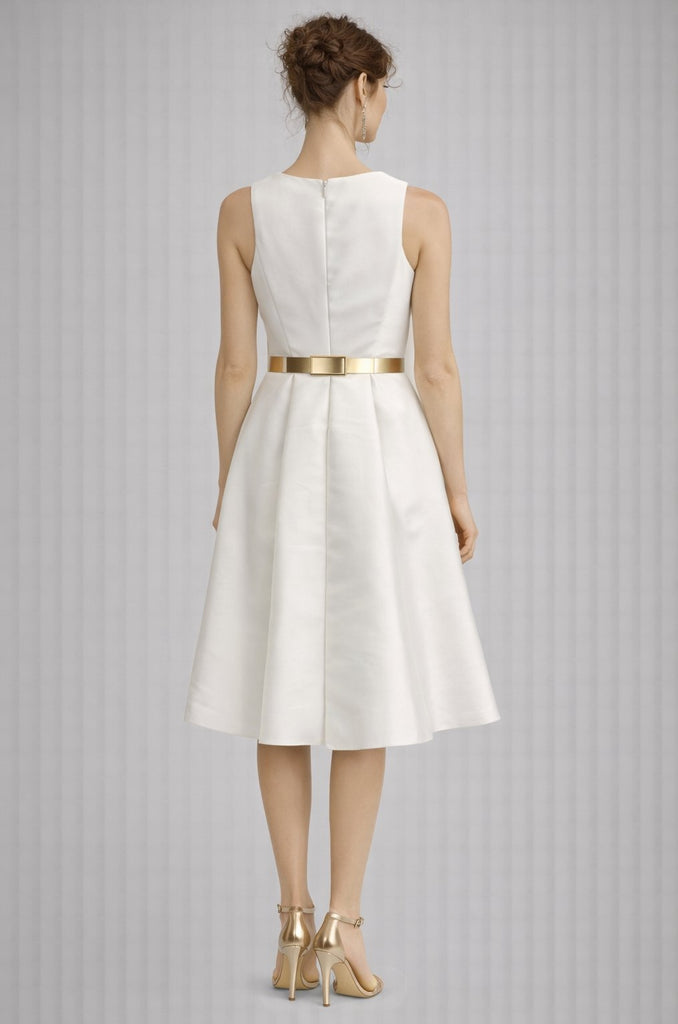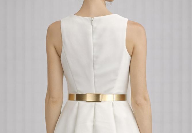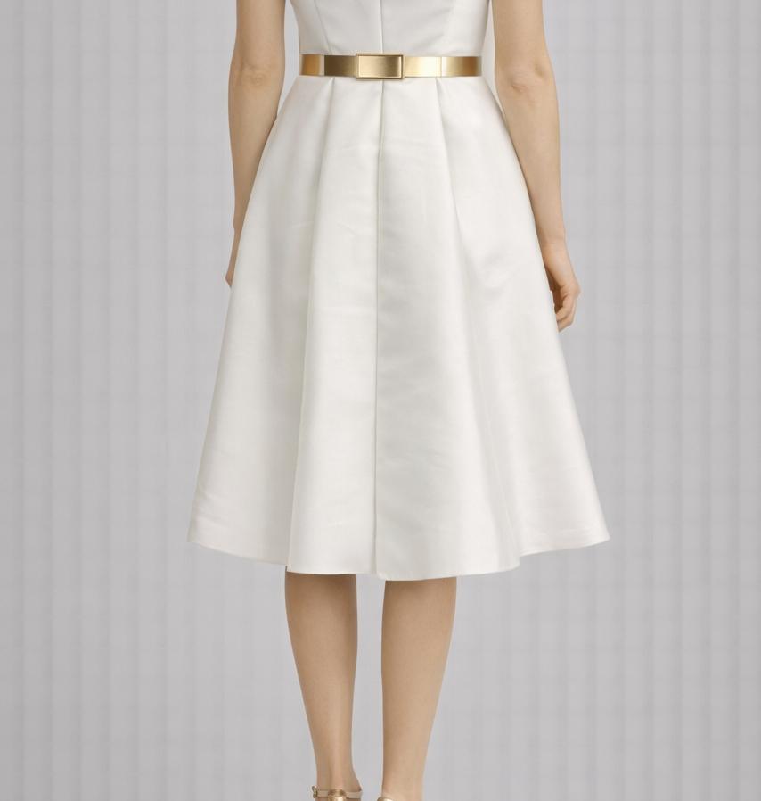 La scollatura ampia e le spalle scoperte esaltano il décolleté con delicatezza, mentre la gonna svasata dona movimento e armonia a ogni passo. Completa il look la cintura in vita con finitura dorata, pensata per sottolineare il punto vita e impreziosire l’insieme.