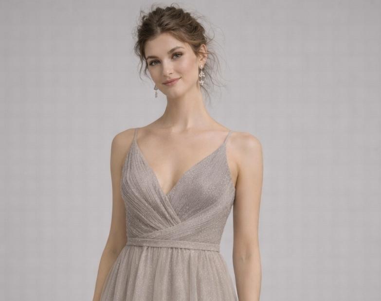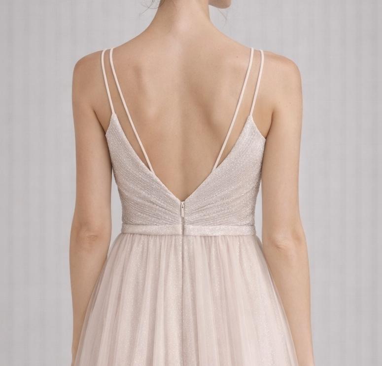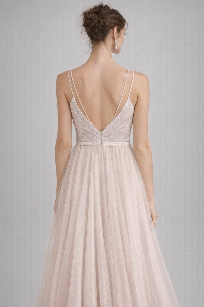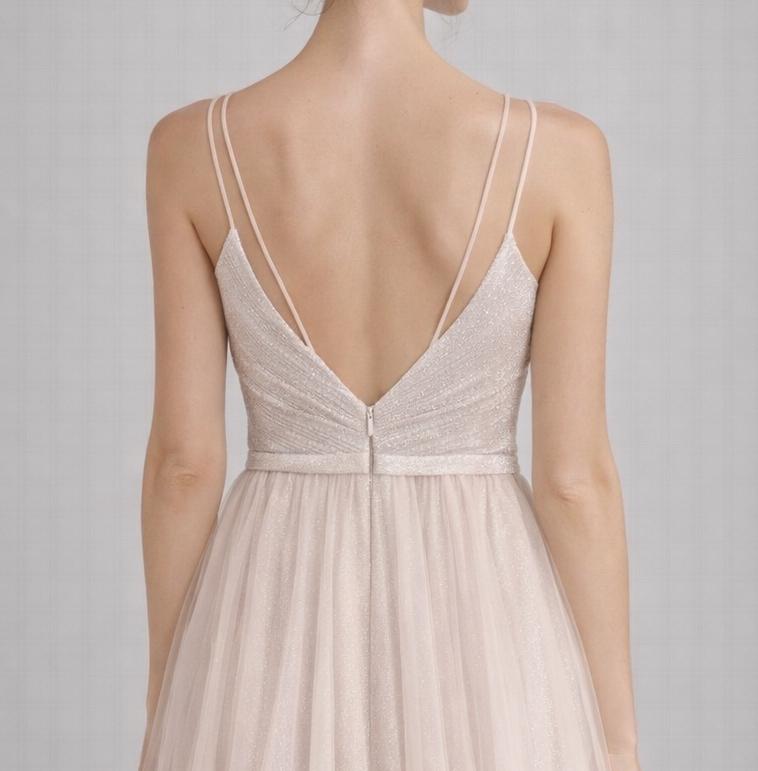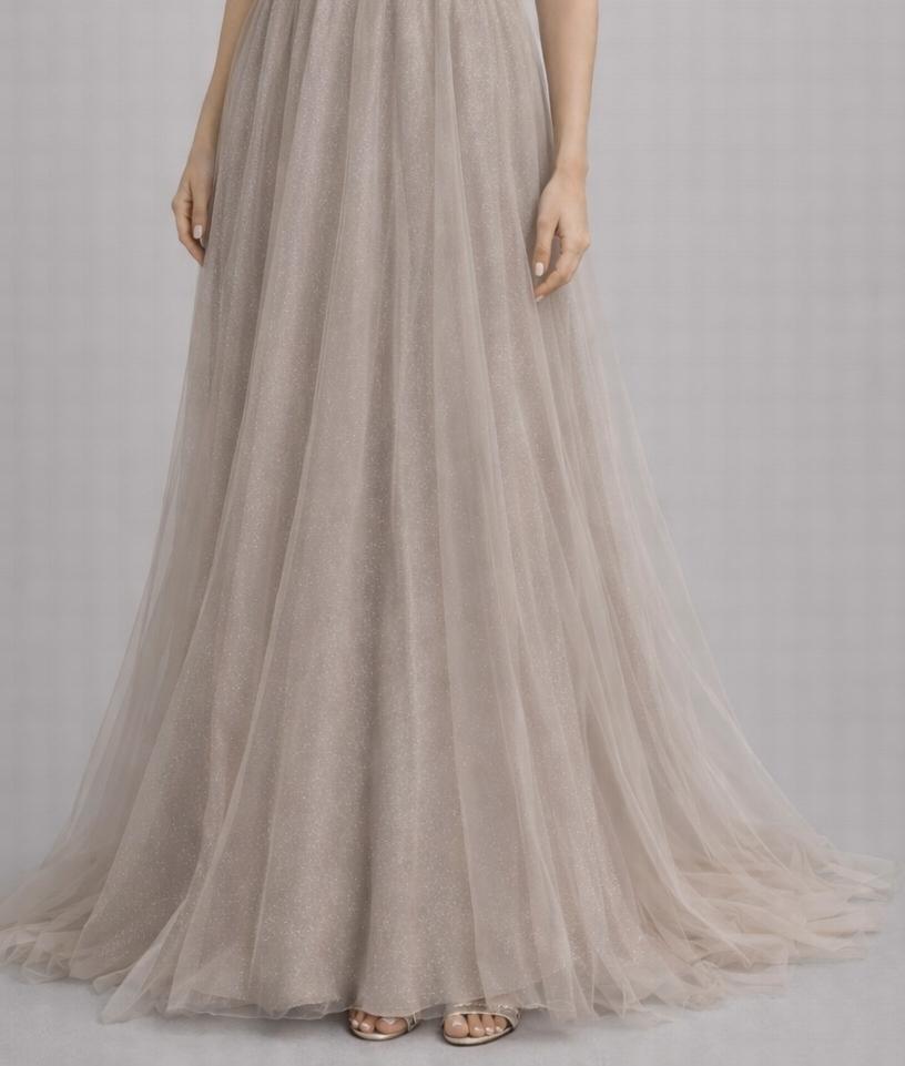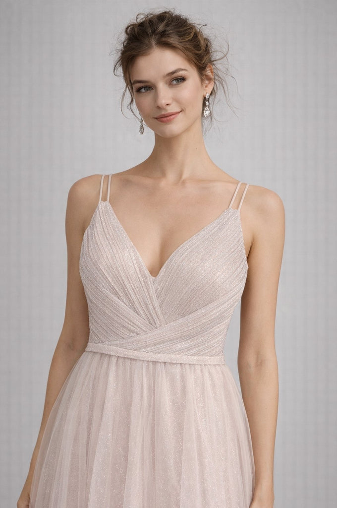 Il corpetto con scollo a V incrociato valorizza il décolleté, mentre le sottili spalline donano leggerezza e femminilità. La vita definita slancia la figura e la gonna ampia e vaporosa scende morbida fino a terra, regalando unallure eterea e raffinata.