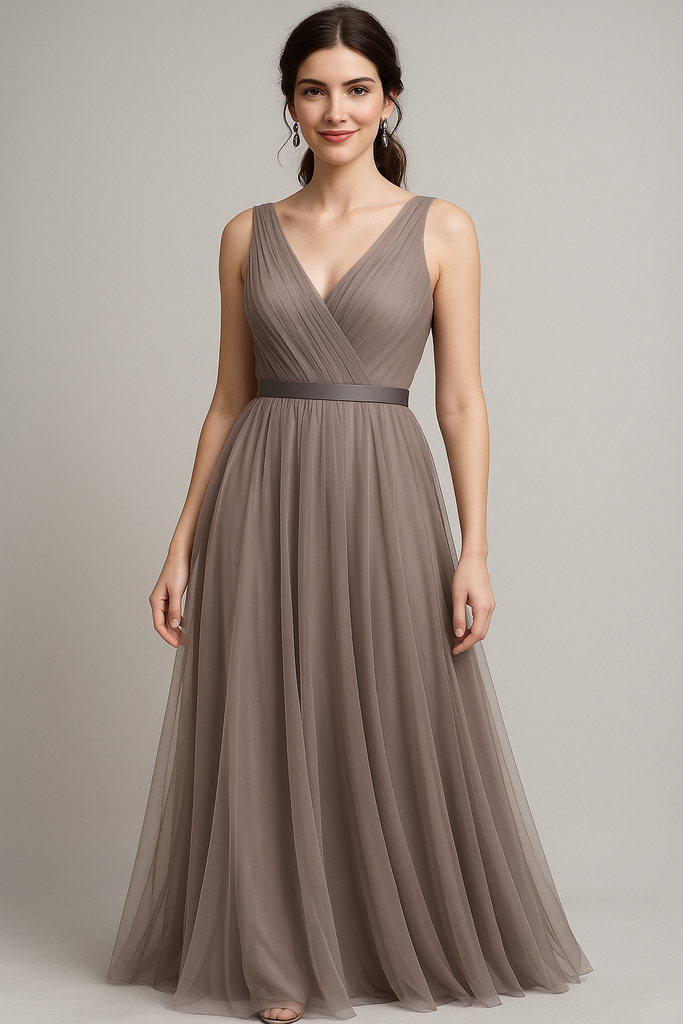 Abito in tinta unita a spalla larga, in poliestere effetto raso sovrastato da tulle leggero ed elegante con cintura in vita.