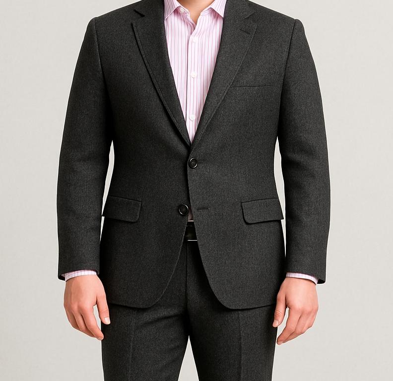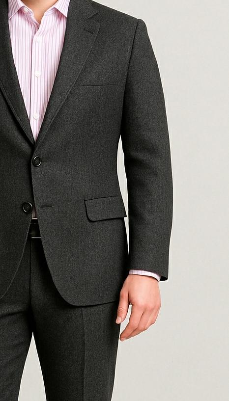 Giacca: due bottoni, tasche con aletta, taschino sul petto, due spacchi laterali, due tasche interne