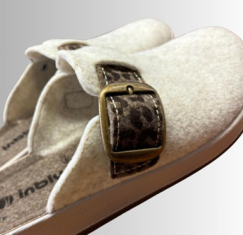 Queste ciabattine in lana cotta uniscono praticità, calore e stile in ununica calzatura da casa. La tomaia in morbida lana cotta garantisce traspirabilità e comfort, mantenendo i piedi caldi senza farli sudare. Il design è arricchito da una fibietta laterale con cinturino effetto animalier e fibbia in metallo anticato, che dona un tocco grintoso e originale al modello.