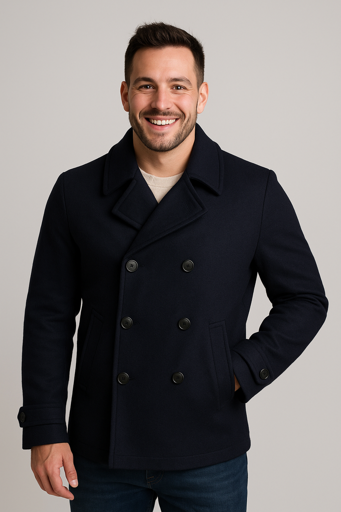 Textura propone questo giaccone da uomo articolo 61844 872010, modello in panno trapuntato all'interno, allacciatura doppio petto, tasche laterali esterne e tre tasche interne.