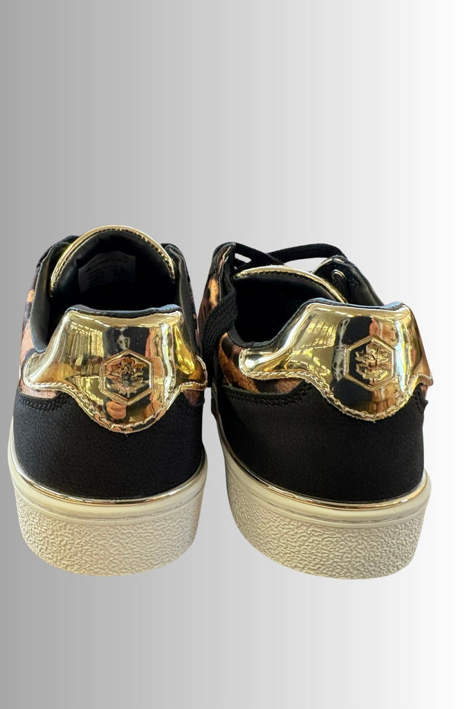 Le sneakers da donna Lumberjack uniscono praticità e design accattivante, perfette per chi cerca una scarpa versatile e di tendenza. La tomaia presenta un mix di materiali che gioca sui contrasti: inserti in tessuto animalier leopardato, dettagli neri a contrasto e inserti metallizzati dorati sul tallone e intorno agli occhielli. La suola in gomma bianca, alta e robusta, garantisce stabilità e comfort durante l’intera giornata, mentre la chiusura stringata offre una calzata sicura e regolabile.