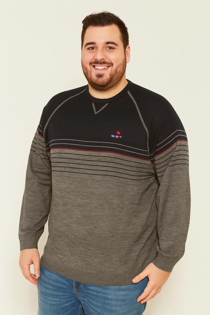 Granchio propone questo maglione conformato da uomo articolo 18781 CONF, modello girocollo, con fantasia a righe, polsini ed elastico sul fondo.