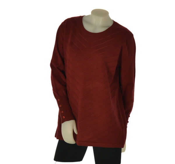 Maglione donna Gaia Più dallo stile sobrio e raffinato, pensato per offrire comfort e femminilità nelle taglie over. Realizzato in maglia rasata con lavorazioni diagonali sul davanti, presenta un fondo diritto e polsini lunghi a costine arricchiti da bottoncini ornamentali.