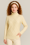 Maglione da donna Valerie, modello collo dolcevita in maglia rasata, rifinito con collo, polsi e bordo a costine. La parte frontale è arricchita da una raffinata lavorazione a rombi che dona eleganza e personalità al capo. Gli spacchi laterali sul fondo garantiscono comodità e libertà nei movimenti. Realizzato in pura lana merino extrafine, offre morbidezza, calore e qualità superiore, ideale per affrontare la stagione fredda con stile.