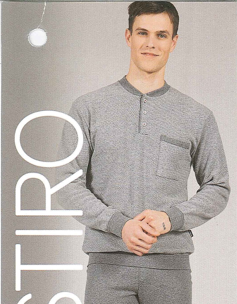 Pigiama uomo pratico e confortevole, con maglia jacquard orlata dotata di collo serafino con bottoni e taschino sul petto.