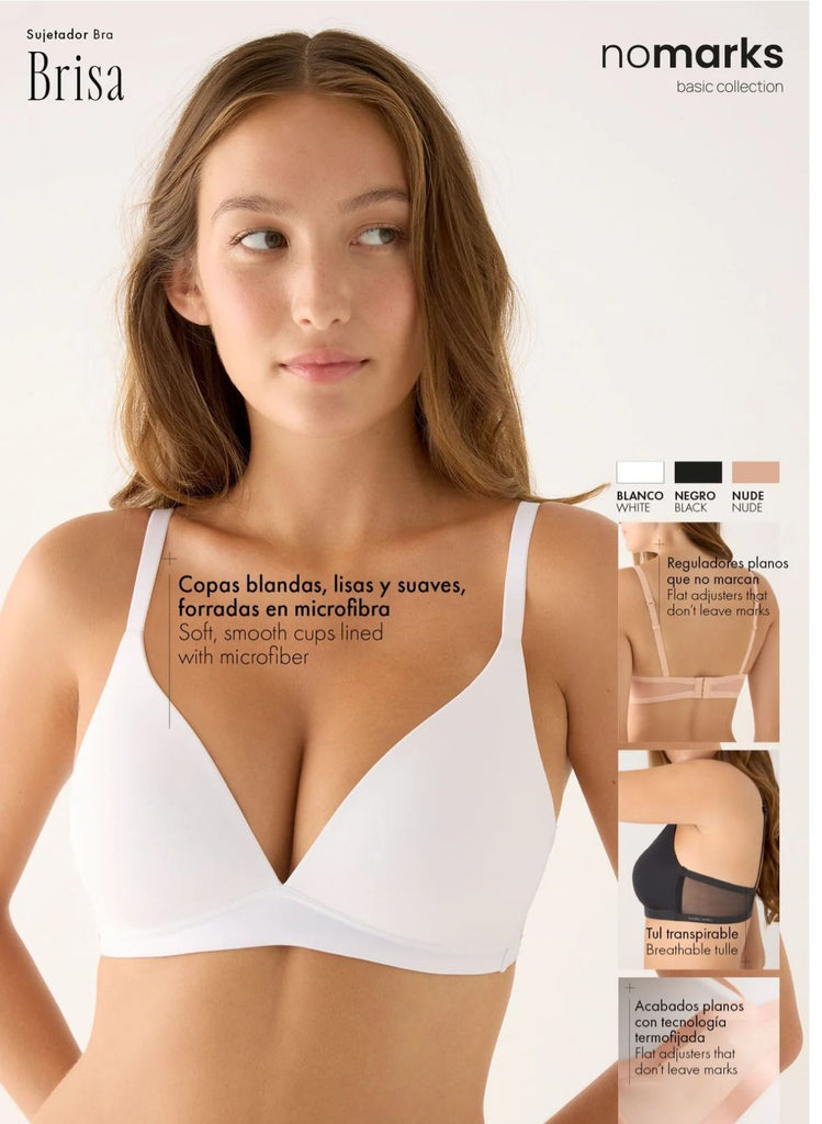 All'interno della linea nomarks, il modello Brisa incarna una vita senza pressioni e un dialogo di benessere con il proprio corpo. È un reggiseno senza ferretto che massimizza il comfort senza compromettere la vestibilità.