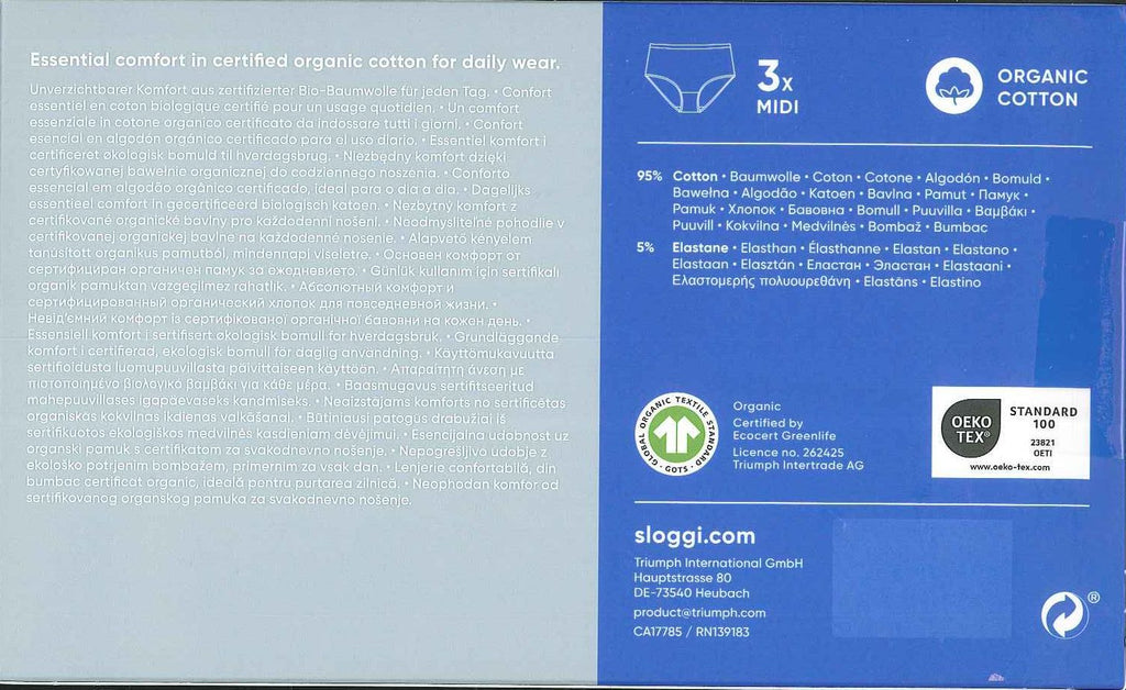 Slip donna modello midi in cotone organico certificato, morbido e delicato sulla pelle. Scheda tecnica: Articolo: GO Daily Cotton Confezione: 3 pezzi Modello: slip midi Certificazione: cotone organico Composizione: 95% cotone, 5% elastano